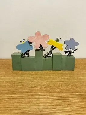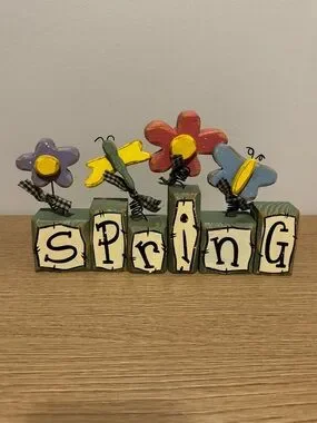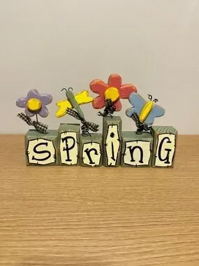 Decorative wooden block sign spelling 'Spring'. Hand-painted pastel flowers and butterflies on top. Rustic farmhouse look. Ready to display on a shelf or tabletop. 9” long x 3.25” tallest block and 1.25” wide!