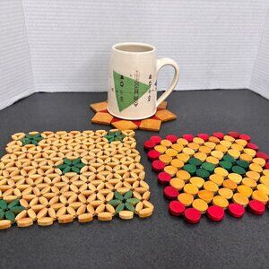 2.Vintage Wood Bead Trivet Hot Pad Counter Protector Kitchen Decor Natural Red and Green