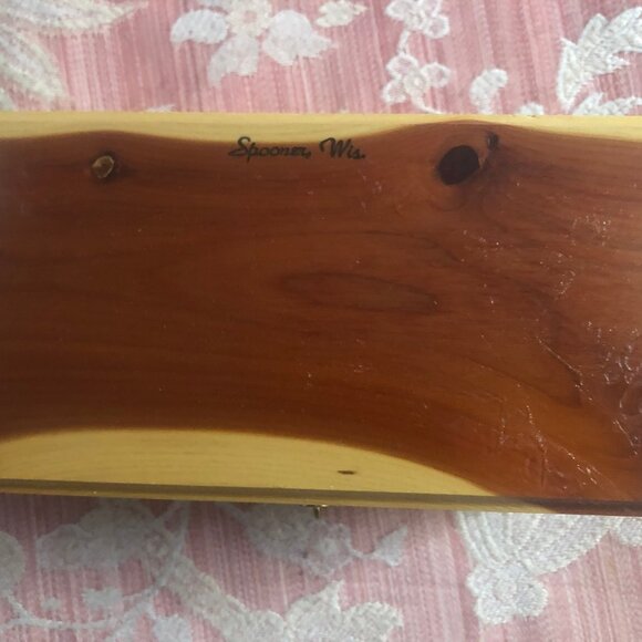 It is a wooden box with tape on the bottom and inside. It is clean and in good used condition.