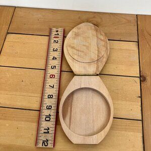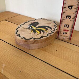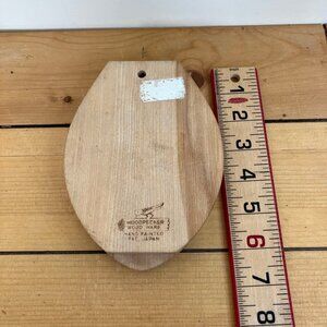 Vintage Woodpecker Wood Ware wooden door knocker has a hollow in the back piece, so knocker resembles a woodpecker's sound when used. Front has a hand painted design of a rooster. Made in Japan. Has a hole on the back for hanging/mounting. Approx. 6 1/4" long x 4 1/2" wide x 1 1/4" thick. Good pre-owned condition, glaze/varnish has some crazing lines from age.