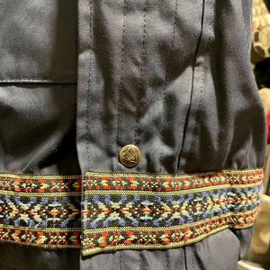 Dark blue, zippered with closures and fur-lined hood. Size Large