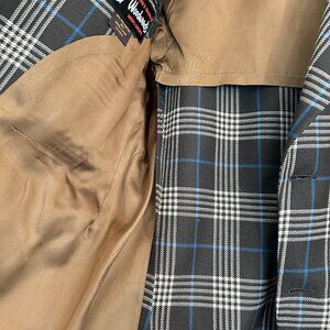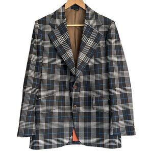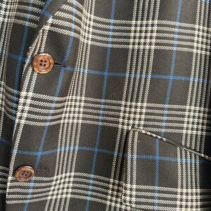 Unique Men’s Woodward’s Harrodale vintage plaid wool jacket in a brown base with blue and beige stripes. Though it looks dark gray in photos, it is definitely brown — and brown + blue was a classic 90s menswear combo.