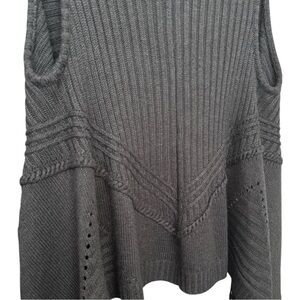 Cozy charcoal grey knit vest featuring a ribbed shawl collar, open front, and fringed hem. Soft midweight knit with textured paneling makes it an easy layering piece for cooler weather.