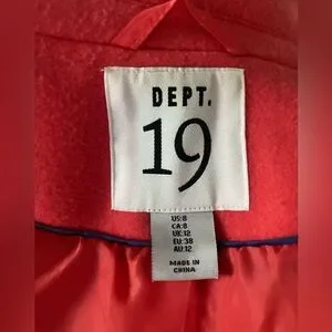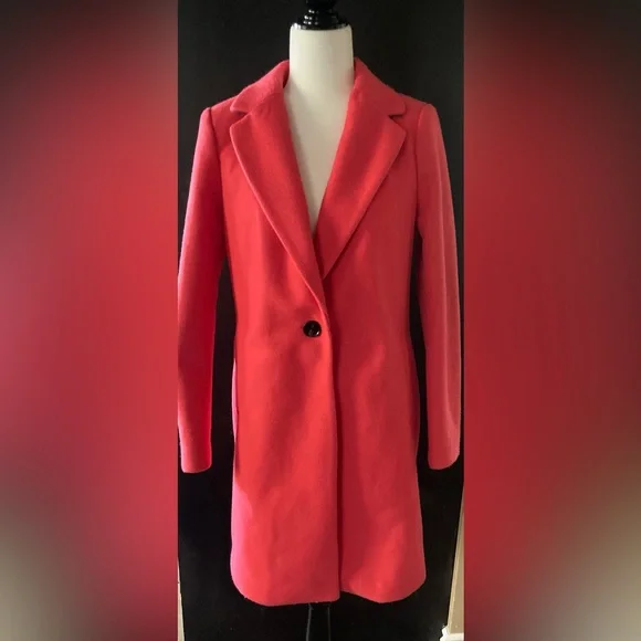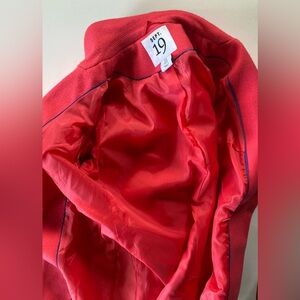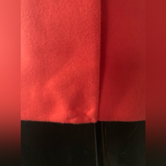 Wool blend coat for colder temperatures in excellent condition. Barely worn if at all. Back flap still sewn closed. This is a coral red/orange colour. Very sleek and professional looking. One button closure. 37” shoulder to hem, 18” pit to pit, 18” waist & hips laying flat and done up. This is very beautiful coat suitable for casual or workwear. Size 8 label but will fit a size 4/6 best.