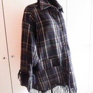 Never worn. Shirt jacket in thick, woven wool-blend fabric. Collar, buttons at front, and large patch pockets above hem. Dropped shoulders, long sleeves, and wide foldover cuffs. Decorative fringe at cuffs and hem. Art. No.:0892174001 Wool 53%, Polyamide 25%, Polyester 12%, Acrylic 10%