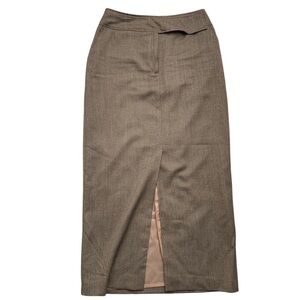 Tailored brown wool-blend skirt with a front slit and full lining.
