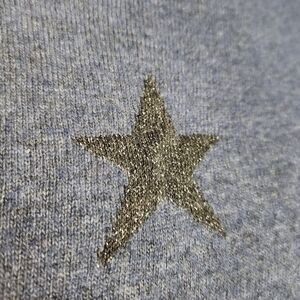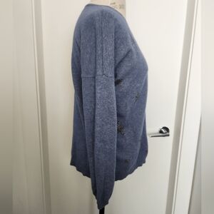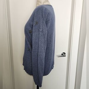 Charcoal blue knit long sleeve crewneck sweater with sparkly silver black stars and ribbed trim, by Hekla & Co.