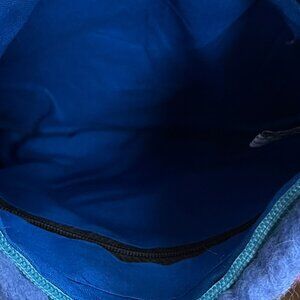 A very cute little bag in a great violet purple colour, with flowers in front and royal blue cotton interior.