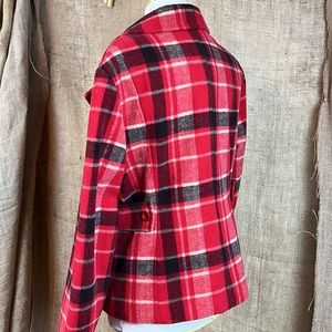 @jojokool I added 2 extra pics to the listing. The coat plaid leans more to a beige, not white, in my opinion. I'm not sure about the buttons, so I hope the extra pictures help. The sleeve measurement from the top shoulder seam is 23".