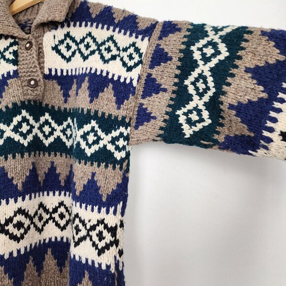 handmade sweater, wool sweater, geometric sweater, collared sweater, buttoned sweater, handmade in Ecuador, cozy wool sweater, beige and blue sweater, stylish wool sweater, warm winter sweater, ethnic pattern sweater, wool knitwear, Wool Knit