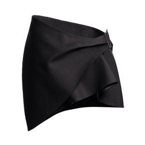 Mugler H&M. Tailored mini skirt in woven wool. Extended waistband with a metal buckle at one side engraved with designer's logo. Asymmetric waist with wrapover front and a pleat for a draped effect. Zipper at one side with star-shaped zipper pull and a concealed hook-and-eye fastener. Sightly asymmetric hem. Lined.