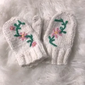 💟 White woollen mittens with floral detailing