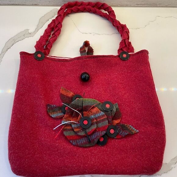 The cutest wool handbag Purse with flower and button details Lined with a cute strawberry fabric with an inner pocket