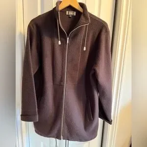Brown Sweater or Fall/Spring jacket. 100% Wool, dry clean only. Jaxsport woman’s size Large. Very roomy -fits more like an XL. Has drawstring at bottom and at neck. In excellent shape. Soft spun wool-not at all prickly/itchy. Has side pockets.
