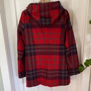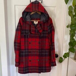 Wool Women’s Pea Coat Red Plaid Hooded Double Breasted Fall Winter