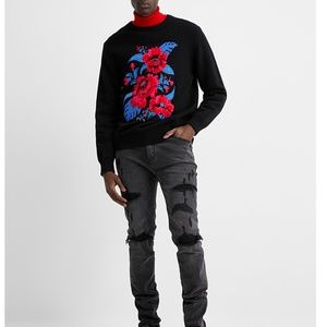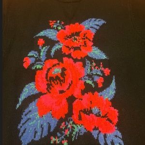 Wool blend black, blue and red floral jacquard sweater new with tags. Rococo-inspired sweater with a romantic accent touch, crewneck, soft and very comfortable 50% wool blend knit Marked sized S. All measurements are approximate and taken with the garment laying flat: Armpit to armpit 20.5’’ Total length 26.5" This item comes from a smoke free, pets friendly home. Recycled bags/box used when possible. Please, let me know if you'd like any additional pictures and/or measurements or other info. Thanks for watching!