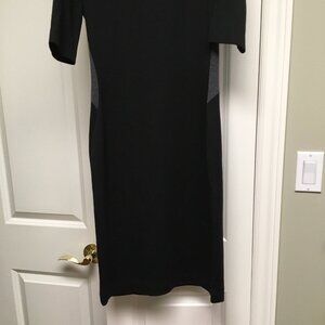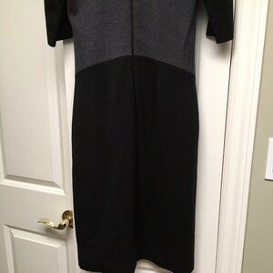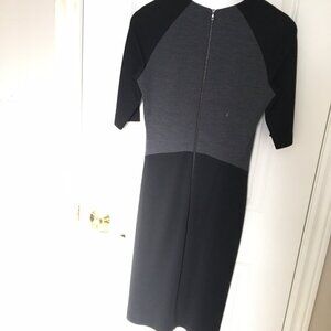 Wool column dress by Lida Baday in size US6. High round neckline, raised empire waist. Raglan elbow length sleeves. Center back exposed metal zipper. The front is black, with contrasting grey inserts at the sides which continue in the back, top half of the back is grey. The inserts have a slimming effect. Chest (flat) is 17 inches, waist (flat) 14 inches, hips (flat) 17 1/2 inches, length 40 1/2 inches. The content tag is removed, but if I remember correctly, it's wool or wool blend. It's a thick, stretchy knit. Lined in stretch nylon. Retailed for $720. The dress has been worn and loved, professionally cared for (dry cleaned). I'm only selling it because it's a bit small for me now. It's figure hugging, extremely flattering and warm for winter; in excellent condition.