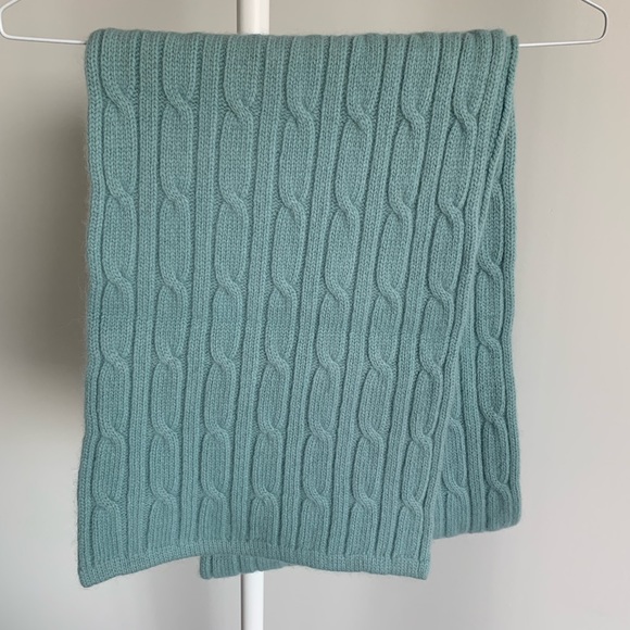 For the scarf: length : 64 inches or 162,5 cm and width: 10 inches or 25,5 cm; the colornis more blue than green ; i would describe it (sorry about my english..) as pale turquoise blue or even « baby » blue