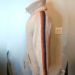 Wool zip up Cardigan jacket with fleece lining. 100% wool size L. By Laundromat. Tan with gray, brown, and rust striping down the arms.