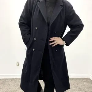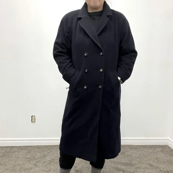 Navy blue jacket, chic and warm! Ignore the string on the left hand side, it’s not part of the jacket but the camera shutter I’m holding! Fits like a 12 oversized. Shoulder pads can be removed if you don’t like the extra lift.