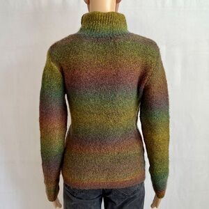A unique turtleneck sweater in an ombré rainbow sunset colour pattern made from a wool-blend in size small from The Outskirts, which specializes in stylish European collections.