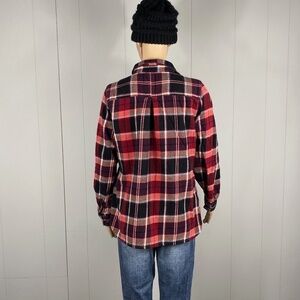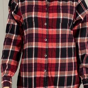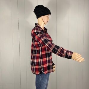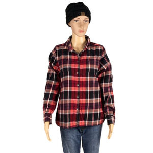 Beautiful condition women's Woolrich plaid button down shirt. Colours are black, burgundy, white and red.