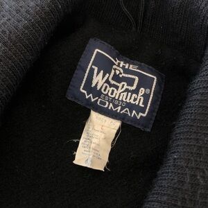Vintage The Woolrich Woman blue heathered black bomber style coat. Beautiful chunky wool texture in the black and blue weave. Asymmetrical front panel with black buttons up the front. Ribbed black curved collar. Buttons at the sleeves. Black lining.