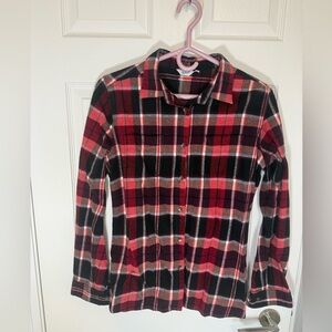 Stylish red and black plaid button-up shirt. Perfect for casual wear for the cozy fall season.