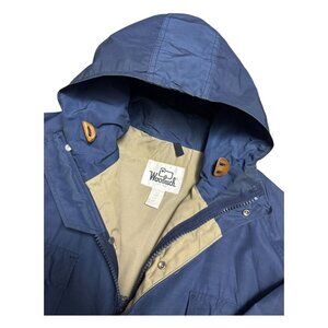Navy raincoat with hood. Features multiple front pockets. Ideal for wet weather.