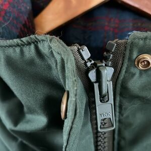 A truly rare find. This vintage Woolrich barn coat is crafted from durable wool with a cozy plaid flannel lining and authentic coyote fur trim on the hood. The dark hunter green exterior is rugged and unfaded, built to withstand winter elements while keeping you warm and stylish.