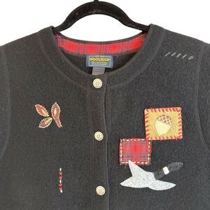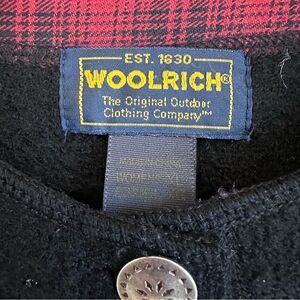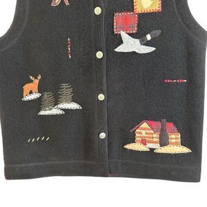In very good condition. Vintage Woolrich black patchwork fall themed vest. 100% wool with embossed pewter tone buttons. This vest has some incredible fall images on the front such as a goose, trees, leaves and a moose. Cottagecore look and exceptional quality. Flat lay measurements: 21.5" pit to pit, 25" length