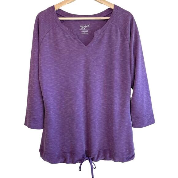 This is a Woolrich 3/4 Sleeve Eggplant Purple Top Size L Split Neck 3/4 Sleeve Waist Tie Detail