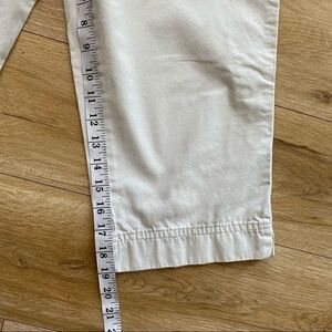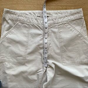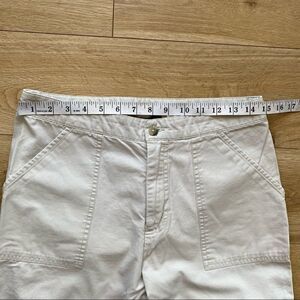 Picturing a beige pair of womens cargo khaki capri's by Woolrich in a size 10.