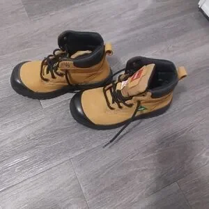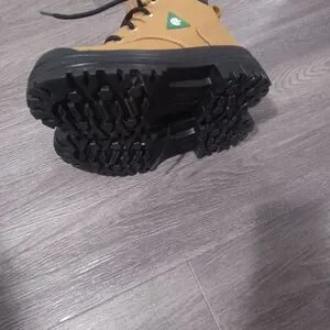 Durable tan and black work boots with sturdy soles. Perfect for outdoor activities.