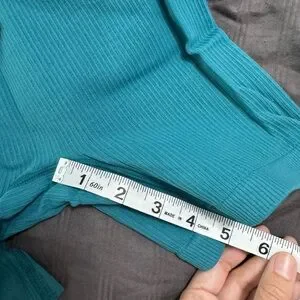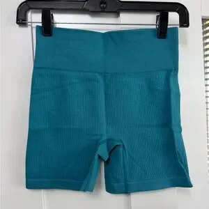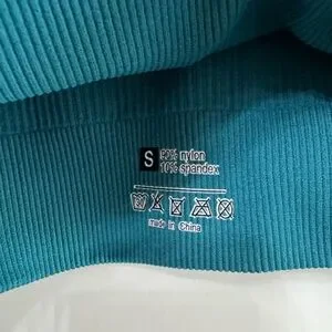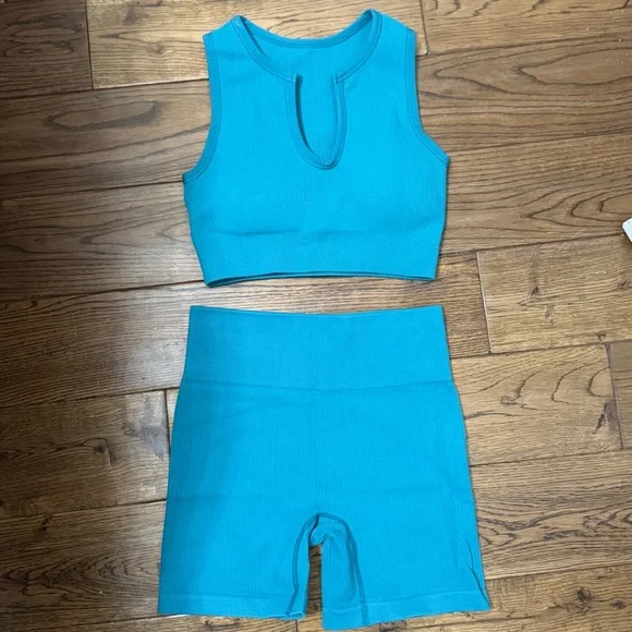 Spandex, ribbed workout top and shorts. Never worn. Both size small. Shorts are 5 inches and top has built in cups. Very comfortable.