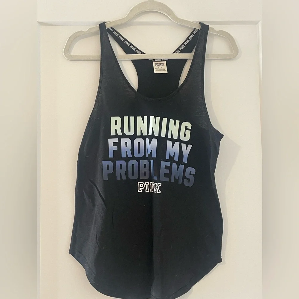 Pink by Victoria’s Secret graphic workout racer back. Graphic says “Running from my problems”. Size Small. Good condition.