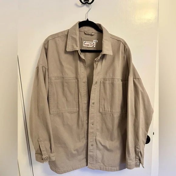 Relaxed-fit workwear style jacket / overshirt with large front patch pockets. Canva-like fabric in a gray / beige colour. Great for spring!