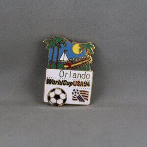 Up for sale is a vintage world cup soccer pin. It is a match location pin for the Orlando venue. The top of the pin has a graphic of a roller coaster with palm trees the location name and official logo are underneath. What a great addition to any soccer collection.