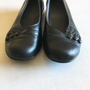 Women's Clarks black leather (upper) shoes with great support & 3 buttons on each side.