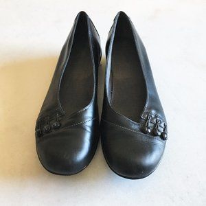 Women's Clarks black leather (upper) shoes with great support & 3 buttons on each side.