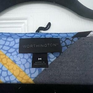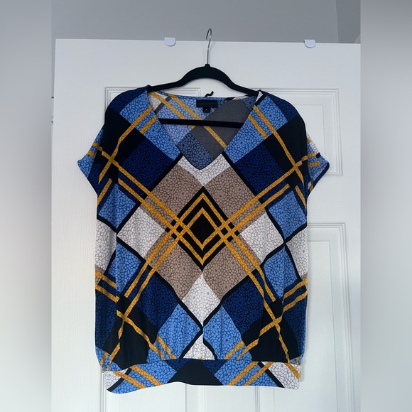 Worthington Blue and Yellow Geometric V-Neck Blouse