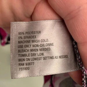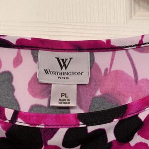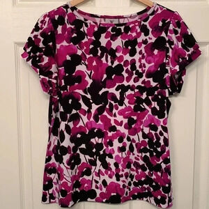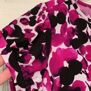 Like new condition. Abstract pattern of fuschia pink, black and white. Short sleeves. Fabric has stretch. Size Large Petite.