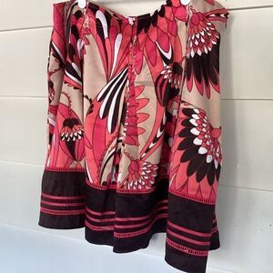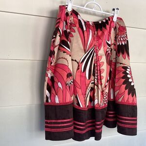 Pink/coral, black and beige, polyester, flower petal floral print, ribbon and open work lace detail on hem, lined, 8” zipper, large stitched box pleats, knee length, EUC, waist to hem 22”, waist side to side 20”.