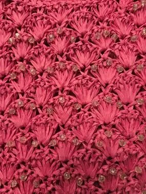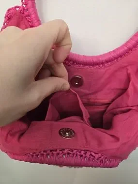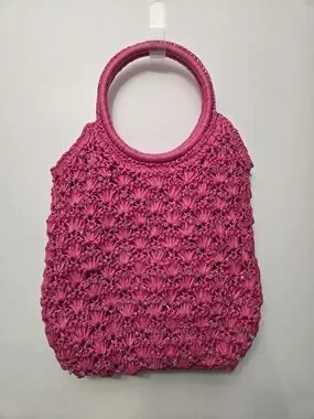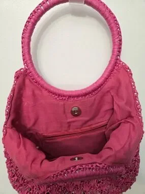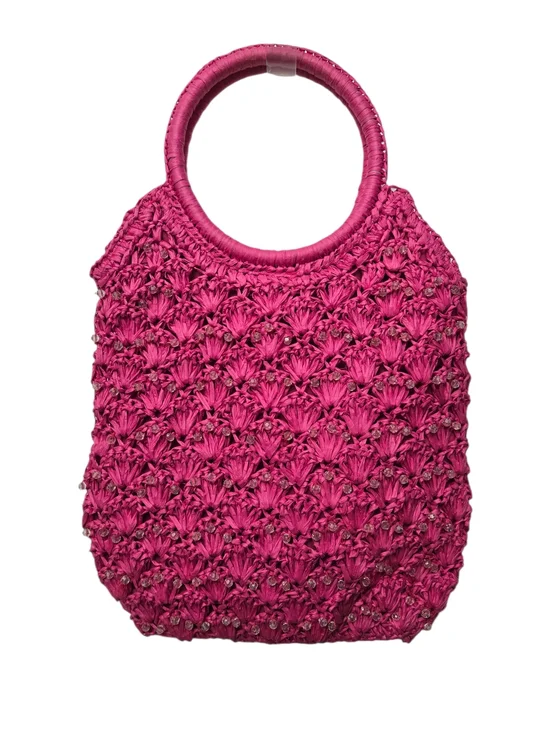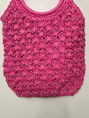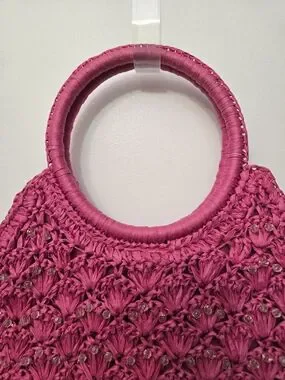 Stylish woven raffia tote in vibrant fuchsia. Features round handles for easy carry and beads sewn into the design. Very