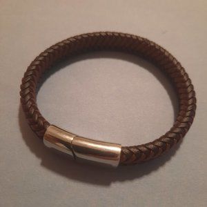 A sleek fastener perfectly accents the smooth woven leather of this simple yet impactful bracelet.
