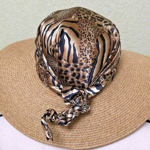 Woven Straw Hat with Animal Print Scarf