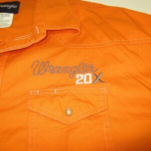 Up for sale is a Wrangler 20 X Western Shirt Men's Orange Pearl Snap Longhorn Rodeo Size 2XL. The shirt is in very good condition with a spellout on one arm. It measures from pit to pit 27" and from the collar down to the seam is 24 inches.
