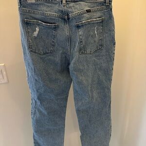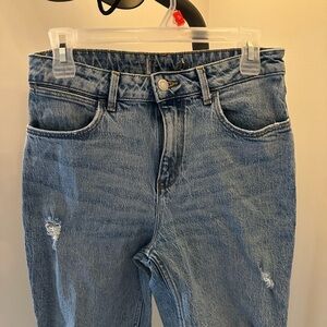 These Wrangler jeans in a classic blue hue feature a relaxed fit with stylish distressed details, offering a contemporary and casual look. Perfect for everyday wear, these jeans effortlessly blend style and comfort.