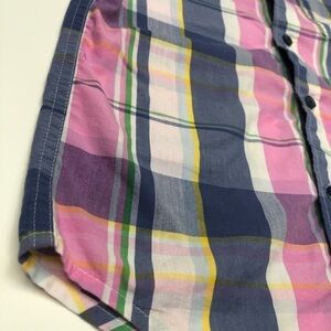 Wrangler button-up short sleeve collared shirt with a pink, white, yellow, navy blue and green plaid color. The buttons are a marble navy and royal blue swirl combo. The bottom hem is scooped. In excellent used condition with no flaws. Please see photos for measurements and details. Boy’s size SMALL (6/7).