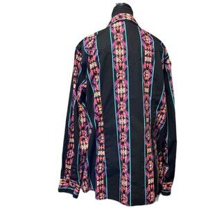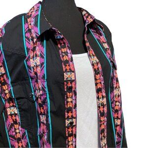 This gorgeous plus size 100% cotton western shirt from Wrangler Retro has a colourful Southwestern print with teal / turquoise bands on a black background.